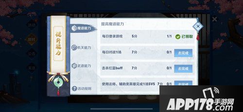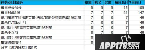 3.提升能力(分数):每日完成登录、对局、完成学科特殊任务可分别魔道、武道、机关三科分数(详见提升能力面板),活动期间分享稷下的邀约(图片)可额外+50分,规则如下表: