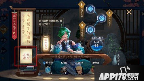 A:在首页点击【邀请好友】,会弹出您的专属稷下邀约书,将其分享出去即可获得50分;