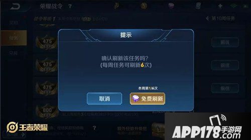 各位召唤师每周将有6次刷新次数,其中仅部分任务可刷新,所有可刷新任务共用次数。每周首次刷新将免费,第二次消耗30钻石,后续每次刷新任务均消耗50钻石,所有刷新次数消耗完毕后,刷新按钮将消失。