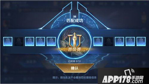 当你达到晋级赛时,首先你会在排位赛界面看到晋级赛标识;开始匹配前,会有晋级赛提示你和你的组队队友们这局是哪位朋友的晋级赛;在正式的匹配确认界面, 队友都能看见晋级赛的标识,匹配到的陌生队友不可见。