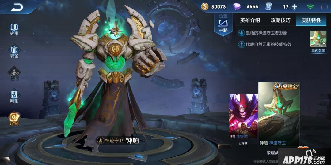 在这款皮肤透露出消息之后,就一直有谣言有说是6元限定皮肤。不过前段时间推出的6元吕布皮肤,证明了只是谣言。现在官方终于实锤是S16战令限定皮肤。这款皮肤主打绿色,技能特效也全是绿色。神迹守卫和钟馗的其他2个皮肤相比其实没有太多的区别,就是颜色换成了绿色。可能会在蹲草丛的时候取得奇效,毕竟草丛也是绿色。总的来说就是值288点卷的价格。