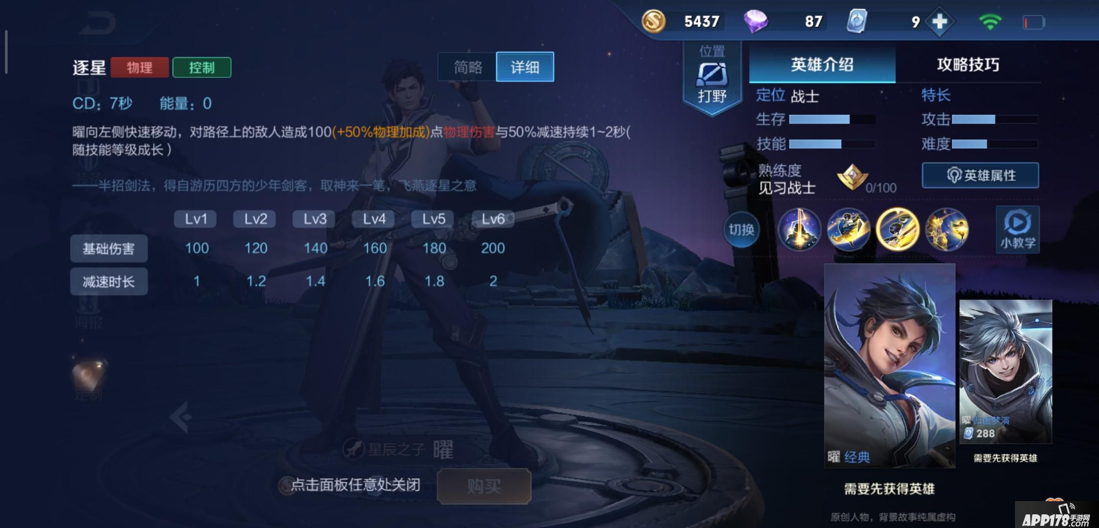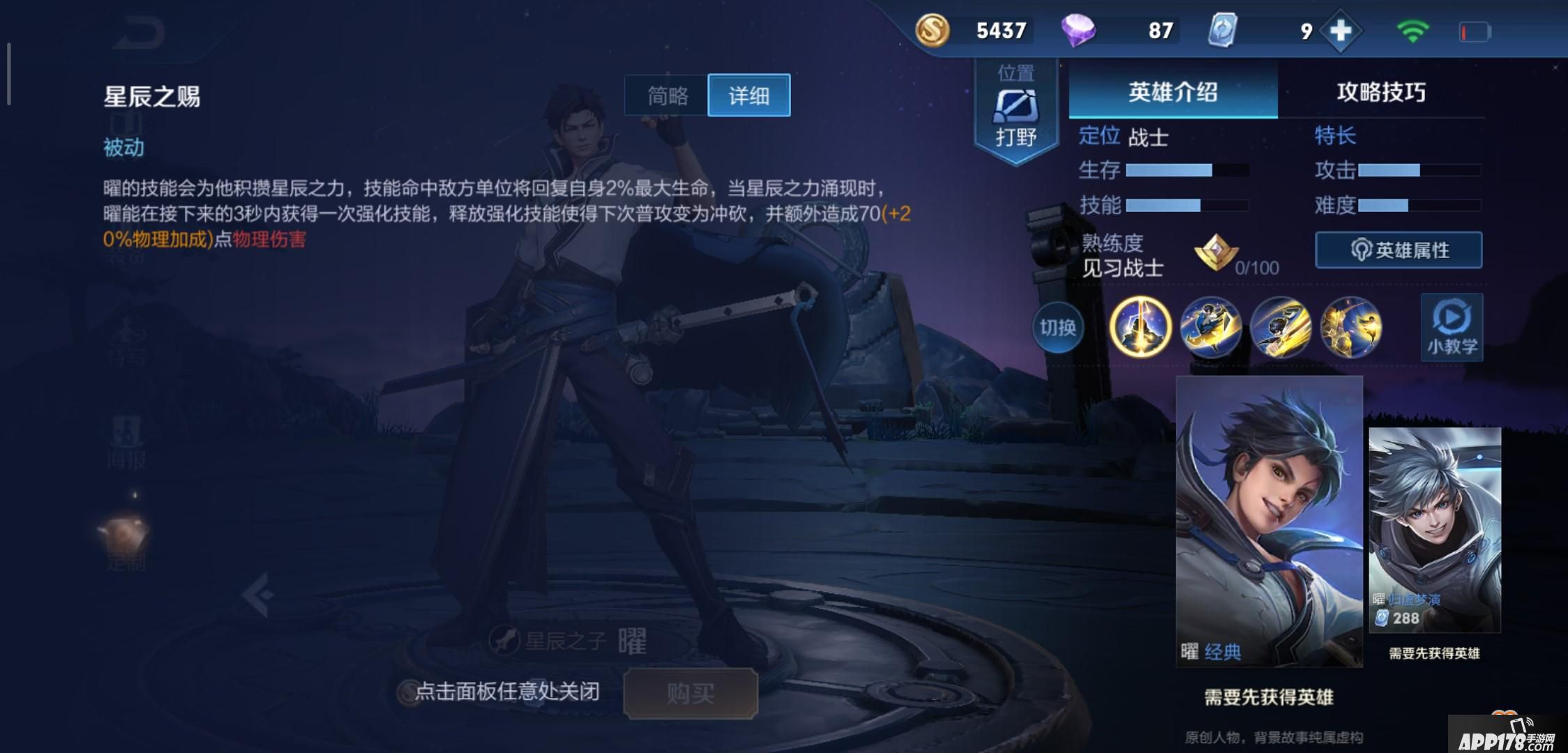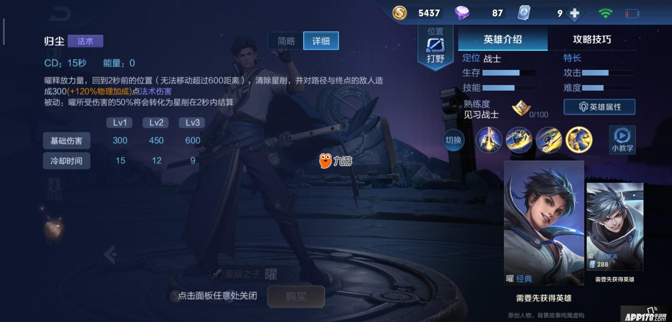 被动:星辰之赐释放技能可积累能量,积满三颗能量转换形态,可无视CD释放一个技能(也就是说曜在释放三次技能之后会强化所有技能但只能释放三个技能中的其中一个,释放三次技能的前提也不需要必须击中目标,也就是说可以在打架之前先攒被动)