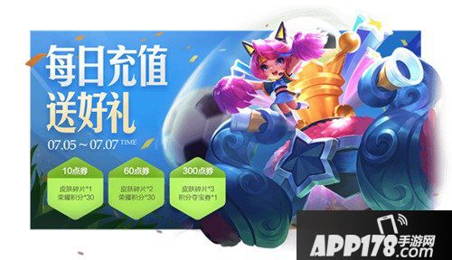 每日充值300点券可额外获得总价值180点券的奖励(皮肤碎片*6+积分夺宝抵用券*1+荣耀积分*60)。