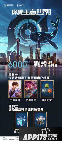 现场探秘打卡即领价值百元游戏礼包;进入王者世界,还有81款英雄,78款皮肤和8套满级铭文等你来免费体验;参与现场开黑,完成助攻、杀敌、签到任务还能获取周边店折扣!