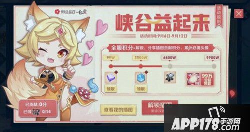 4.获取全服积分奖励:每解锁和分享1张新的插图,均可为全服贡献1积分,全服积分累计达99万、3300万、6600万分别可得钻石、铭文碎片、英雄碎片、99公益日头像框(2019),同时积分到达9900万,同时积分到达9900万,将由腾讯公益和王者荣耀联合捐助给“山村妈妈的逆袭”公益项目99万。