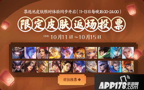 10月11至10月13日每晚6点到12点,本次返场投票候选的20款限定皮肤将限时开放体验。希望大家在自由体验的过程中,决定自己支持的限定皮肤,为他们投出宝贵的一票!