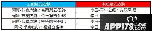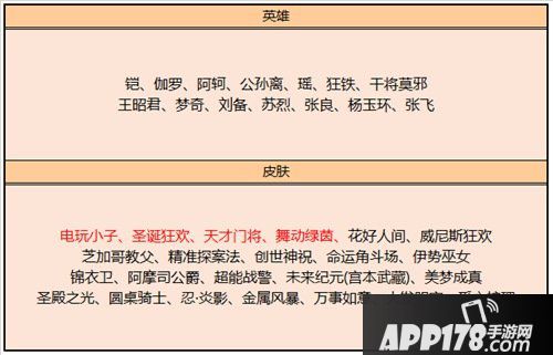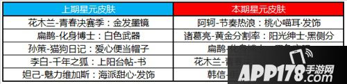 程咬金-星际陆战队、露娜-哥特玫瑰,刘备-汉昭烈帝,太乙真人-圆桌骑士、弈星-踏雪寻梅、狄仁杰-锦衣卫