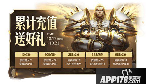 庆新版本更新,累计充值送好礼。累计充值988点券可额外获得总价值610点券的奖励(包括皮肤碎片*13+积分夺宝抵用券*3+铭文碎片*300)。