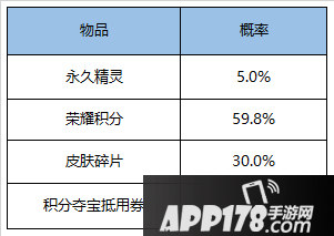 购买红蓝对决(1日),可额外随机获得以下奖励之一:阿鸡(1星)*1、玉仔(1星)*1、皮肤碎片*2、积分夺宝抵用券*1、荣耀积分*10或荣耀积分*20。