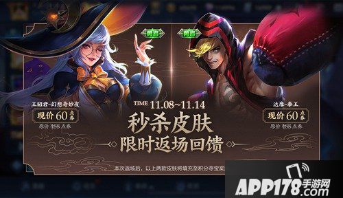 达摩-拳王,王昭君-幻想奇妙夜将在11月8日6元秒杀返场!小妲己已经迫不及待与昭君姐姐和达摩哥哥并肩作战哦!参与游戏内活动可以获得集神秘,浪漫,甜蜜与一身的全新头像框浪漫阿哈&甜蜜阿美。碎片商店也迎来了白起-星夜王子,喜欢使用白起冲锋陷阵的召唤师千万不要错过!