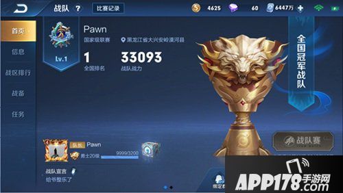 获得称号后,战队首页将展示战队对应赛事级别的奖杯和称号,所有战队成员可见