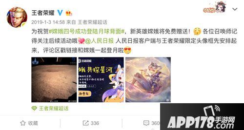 2019年初,为庆祝嫦娥四号成功登陆月球背面,宣传我国的探月计划,《王者荣耀》就曾联动《人民日报》,紧扣“登月”事件,推出航天主题活动,向玩家免费赠送新英雄嫦娥与嫦娥头像框,赢得了众多网友的点赞好评,互动量近万。