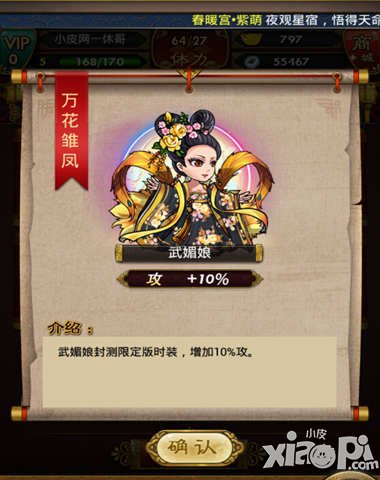 比起金鳞伏龙的速度加20来说,武则天的这件时装附加属性就更加的霸气一些了,攻击加10%。