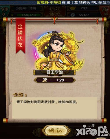 目前封测阶段只有两件时装,金鳞伏龙就是其中之一。附加的效果可不仅仅是外表变的酷炫了,更加重要的是能够晋王李治的属性多加20速度。