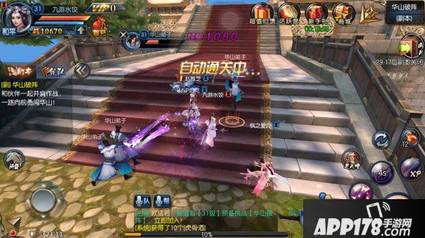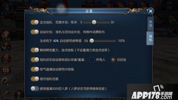与传统游戏相同,《东方不败》依旧采用虚拟按键操作模式。左手控制虚拟摇杆移动,右手释放攻击技能。除此之外,游戏在自动寻路、自动战斗的基础上,增加了自动挂机,让玩家自主设置移动范围、吃药时机,甚至还开按等级开设了挂机副本。这对手残党、以及没有过多时间玩游戏的玩家来说,实乃一大福音。