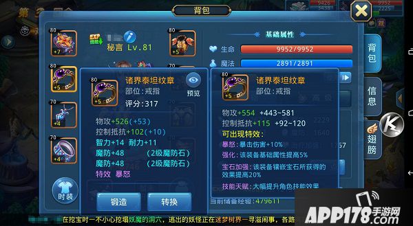 如果小伙伴们不太熟悉装备属性,在看装备的时候,可以点一下装备右上角的小眼睛,系统会有数值参考和特效解说的!首先我们来看看这个戒指的灰字,物攻可以达到的最大值是581.系统推荐553,目前是526。控制抵抗对大值是120,系统推荐115,目前是102。两个基础属性都低了一点点,不过强化后会有加成,所以也还好。