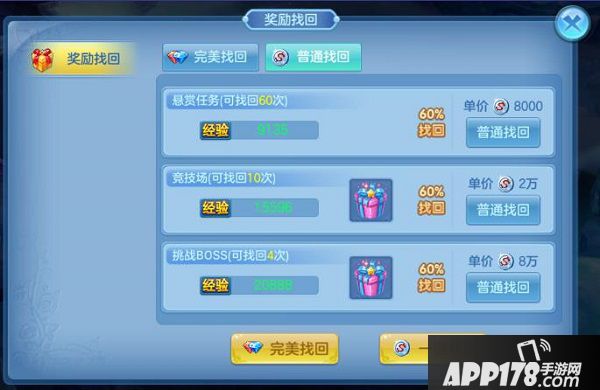 在找回界面中,给玩家提供了两种找回方式,一种是“完美找回”,一种是“普通找回”,完美找回可以找回100%的奖励,普通找回只可以找回60%的奖励;