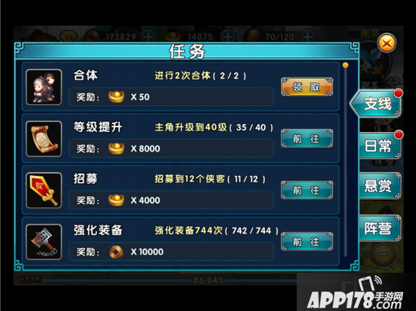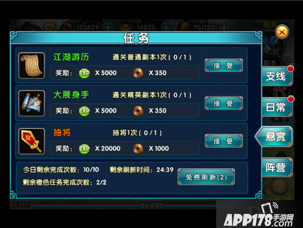 悬赏任务:玩家可刷新任务品质并接取后完成任务,每天仅仅可完成10次任务。