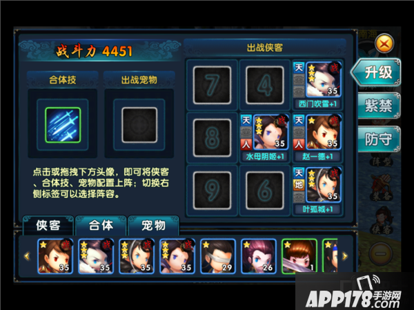 在阵型中可设置侠客站位、合体技能和出战宠物。