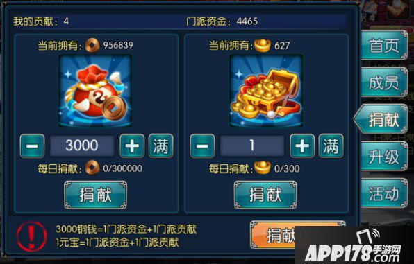 接下来讲一讲门派,门派是玩家的聚集地,也是提升战力的地方。门派里面那么多选项该怎么样安排去做?首先,你可以捐铜钱和元宝,得到门派捐献,捐献也是非常昂贵的,你可以选择使用铜钱捐献,3000铜钱得到一点贡献,元宝则是一个元宝一个贡献。每日贡献也有上限,每个玩家利用铜钱捐献可以得到100点贡献值,用元宝则可以得到300点。你也可以查看捐献排名,排名越来,门派掌门就会给你更高的职位。