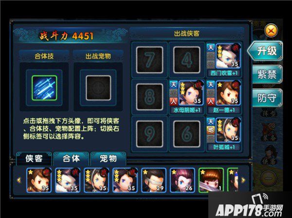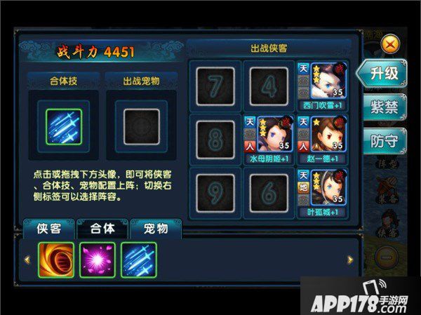 在阵型中可设置侠客站位、合体技能和出战宠物。