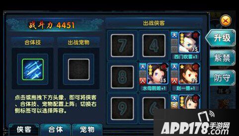 在阵型中可设置侠客站位、合体技能和出战宠物。