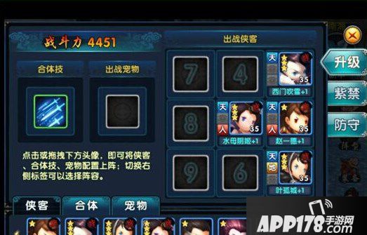 在阵型中可设置侠客站位、合体技能和出战宠物。