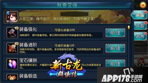 《新古龙群侠传》中的系统十分丰富,强化方式自然多种多样。你可以选择强化装备、也可以通过升级修炼、门派技能提升。为了助力玩家闯荡江湖,《新古龙群侠传》手游推出“我要变强”功能。点击人物头像下方的“我要变强”按钮,便可一览所有可强化战斗力的途径。