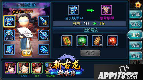 装备强化和装备升阶是提高装备基础属性的两种,其中装备强化最为简单。玩家通过消耗铜币,提升装备等级,即可提升战斗力。装备的最高等级和人物的最高等级一致。如果觉得装备逐个强化也不用担心,直接点击一键强化,免去其他麻烦。装备升阶则需要消耗一些升阶材料,提升装备品质。这些材料可以在江湖游历的特定副本产出。