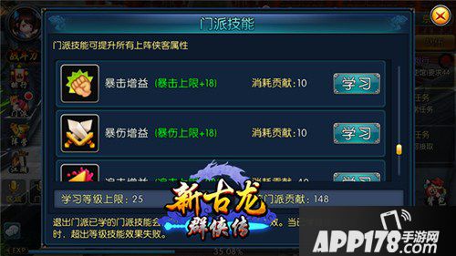 为促进玩家真实实时互动,《新古龙群侠传》手游的门派技能系统极具匠心。玩家需要投入铜币或元宝为门派捐献,学习门派技能,技能等级越高,属性也就越高。建议玩家在学习门派技能时根据侠客阵型进行选择,优先学习收益最高的技能。