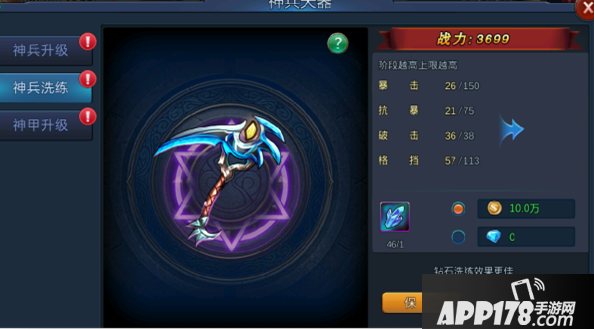 神兵洗练系统,神兵除了提供属性攻击能力,洗练也能增加人物的基础属性,譬如暴击、抗暴、破击、格挡四个属性。这个系统洗练上限随着神兵等级提高而提高