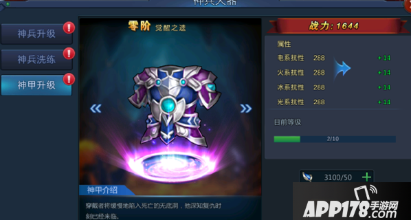 神甲升级,游戏内准备设计来增加元素抵挡能力的一个系统,在这个系统中升级神甲之后,能极大的提高抵抗元素伤害,神甲有7件和神兵系统一样,属性也是可以累加。