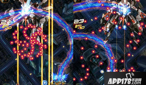 第一种弹是先在手中聚集一小撮子弹,然后猛地朝四周弹射出去。这个弹幕会双手轮流释放一次,弹幕的飞行速度十分快,但是因为太过稀疏,所以很难击中机甲。躲起来十分容易。