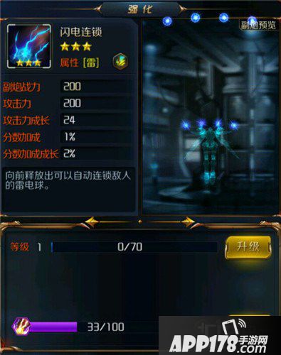 闪电连锁是雷属性的副炮,初始为三星。向前释放出可以自动连锁敌人的雷电球。