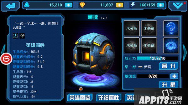 黑球是流浪佣兵的均衡型英雄,依靠机舱里藏的两门球形能量炮,提供大量的输出。黑球和大多数均衡型英雄一样,生命成长较高,物理防御成长也不错,能量防御成长略逊色,可以吸收一定的伤害。黑球的能量攻击成长只能说一般,初始有9.2。