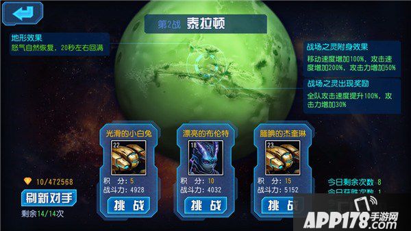 “星球大战”这种进阶玩法,蛮干是不科学的,有许多地方还需要特别注意。首先在战斗开始前,玩家要合理的选择挑战对手,一般都有3个强弱不一的对手可以选择,战斗力最弱的敌人可以提供5点积分,中等的可以提供10点,而最强的敌人有15点积分。要想快速获得积分,对自己战力有自信的玩家肯定选择最强的敌人,而战力较低的玩家选择较弱的对手保证每一次挑战都能战胜敌人,从而稳定的获得积分。