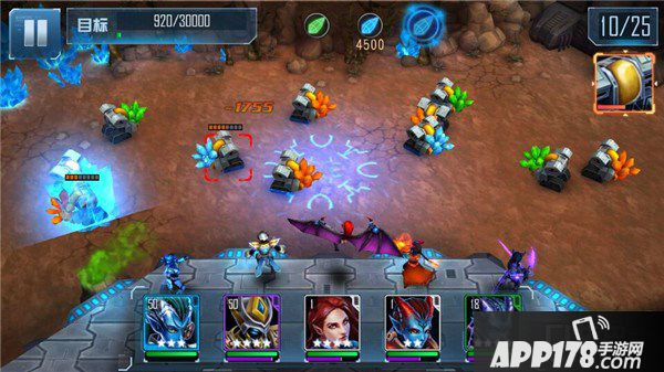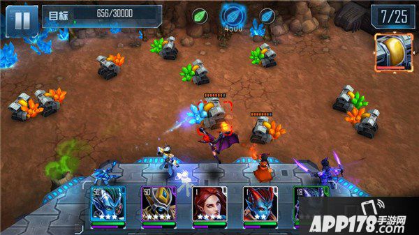 作为资源探索中的第一张地图,“突袭矿场”玩法内容十分考究。玩家在进入地图之前可以选择五名英雄加入战斗,在进入地图之后,五位英雄将一字排开分布在高地之上,通过机枪扫射运输兵来获得资源。运输兵共有25波,并分为蓝色、绿色、橙色三种资源,玩家需要在所有运输兵走完之前手机对应颜色的资源,总资源达到一定数额才算完成任务。而英雄们攻击的目标是随机的,而玩家要做的就是指引英雄攻击任务所需颜色的资源,集火消灭对应的运输兵。