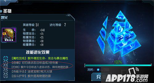 1、烈火“自爆”技能可以对灼烧目标造成3倍伤害;“灼烧”技能可以额外降低敌方物理防御。