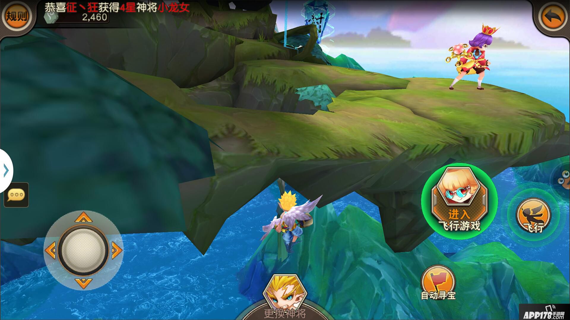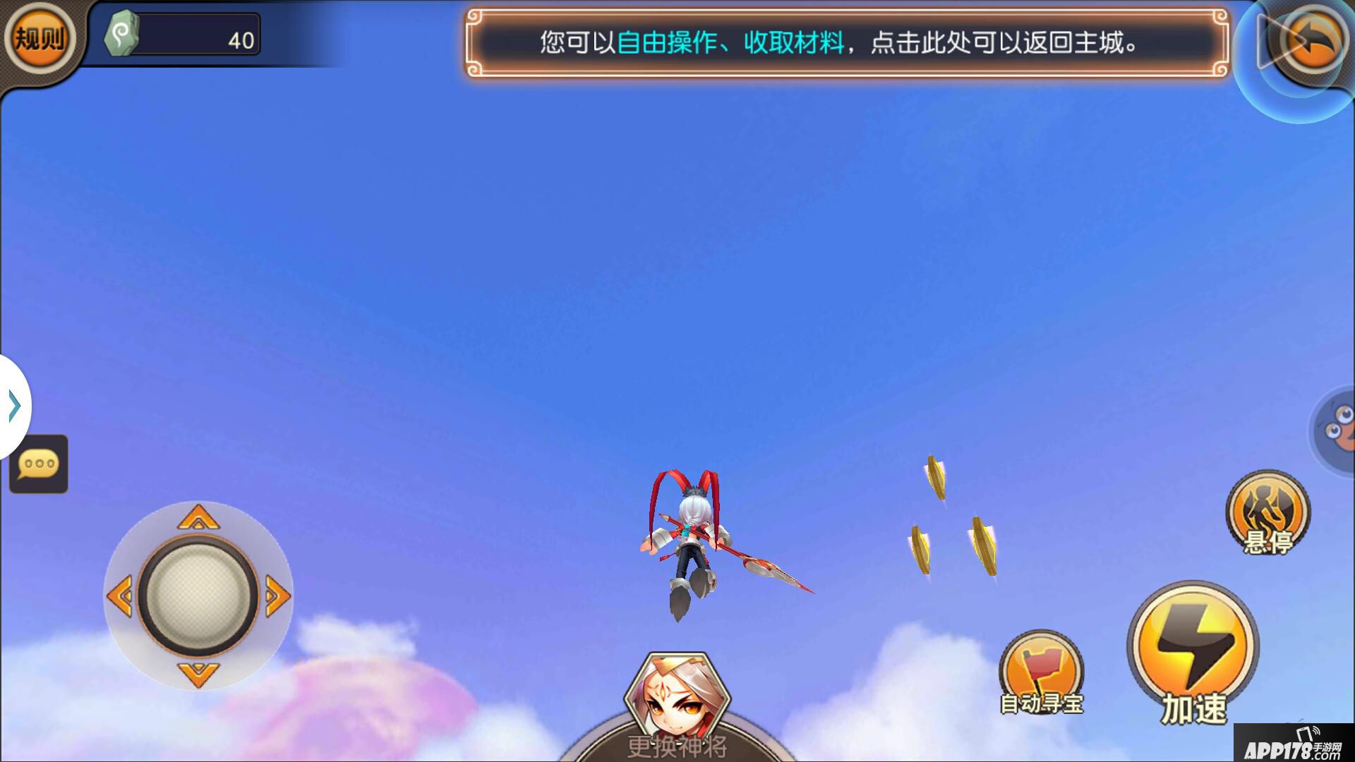 由于取材是神话故事,所以在《天域幻想》中有一种特殊的玩法——飞行模式。神将们拥有飞行的技能,进入到“龙模式”后自由飞行,通过摇杆来操作方向,进行寻宝、收集材料,搭配着优美的bgm也可以切换到自动模式,神将将会自动寻找所需的东西。