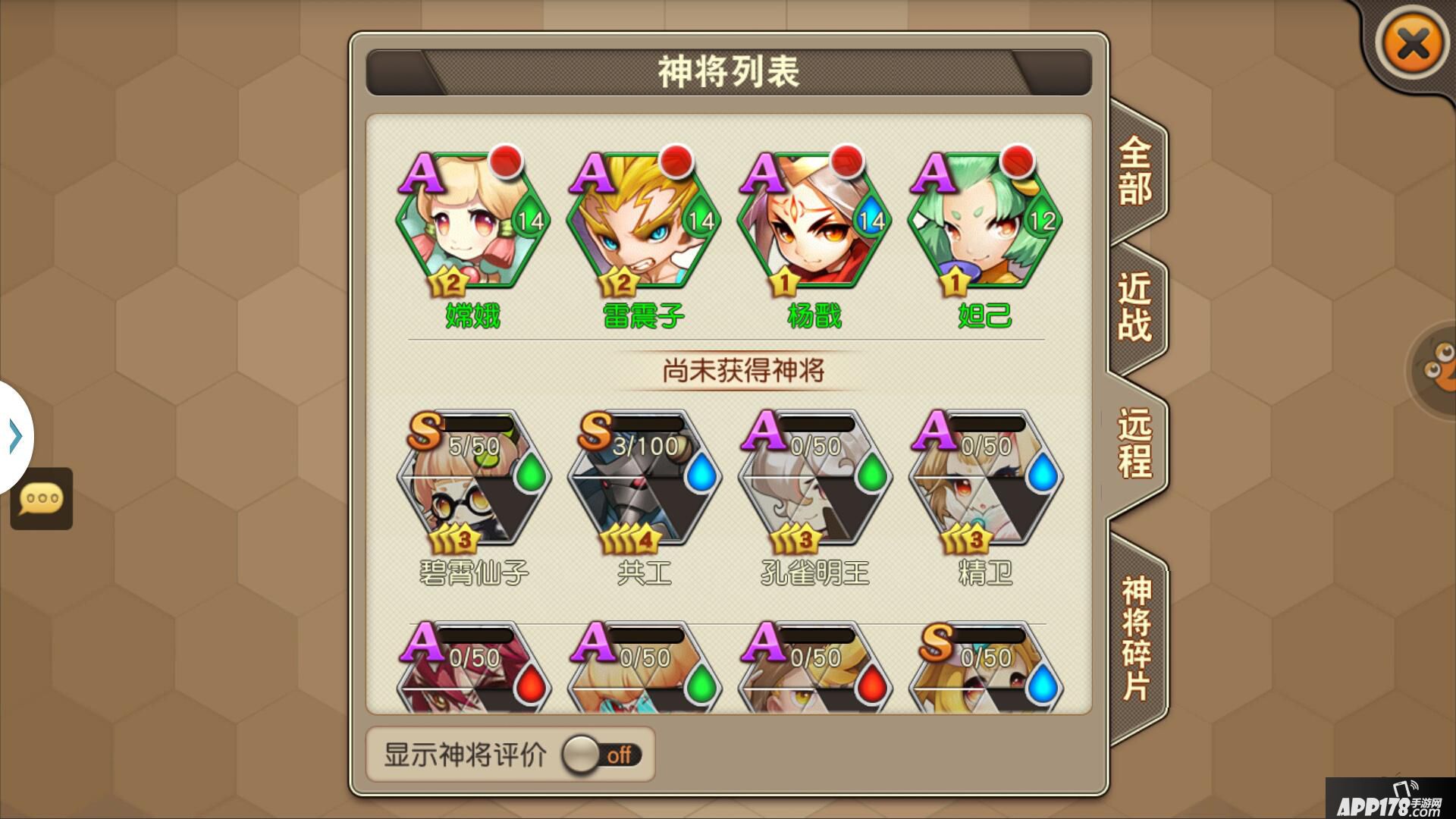 卡牌人物目前开放的忧47位神将,他们各具特色且都是耳熟能详的神话人物,主要分为近战和远程两种。神将碎片主要通过活动、充值或者任务关卡等方式获得,总得来说难度不算大。