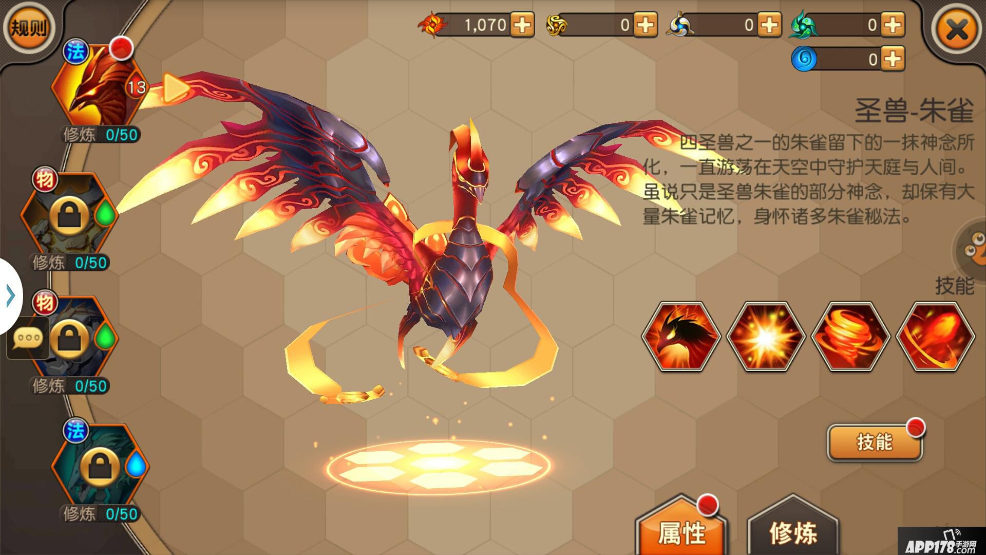 除了神将以外,另搭配圣兽配合作战,圣兽需要通过天赋点来提升技能,28级以后会开启修炼技能,用于强化圣兽的战斗力。