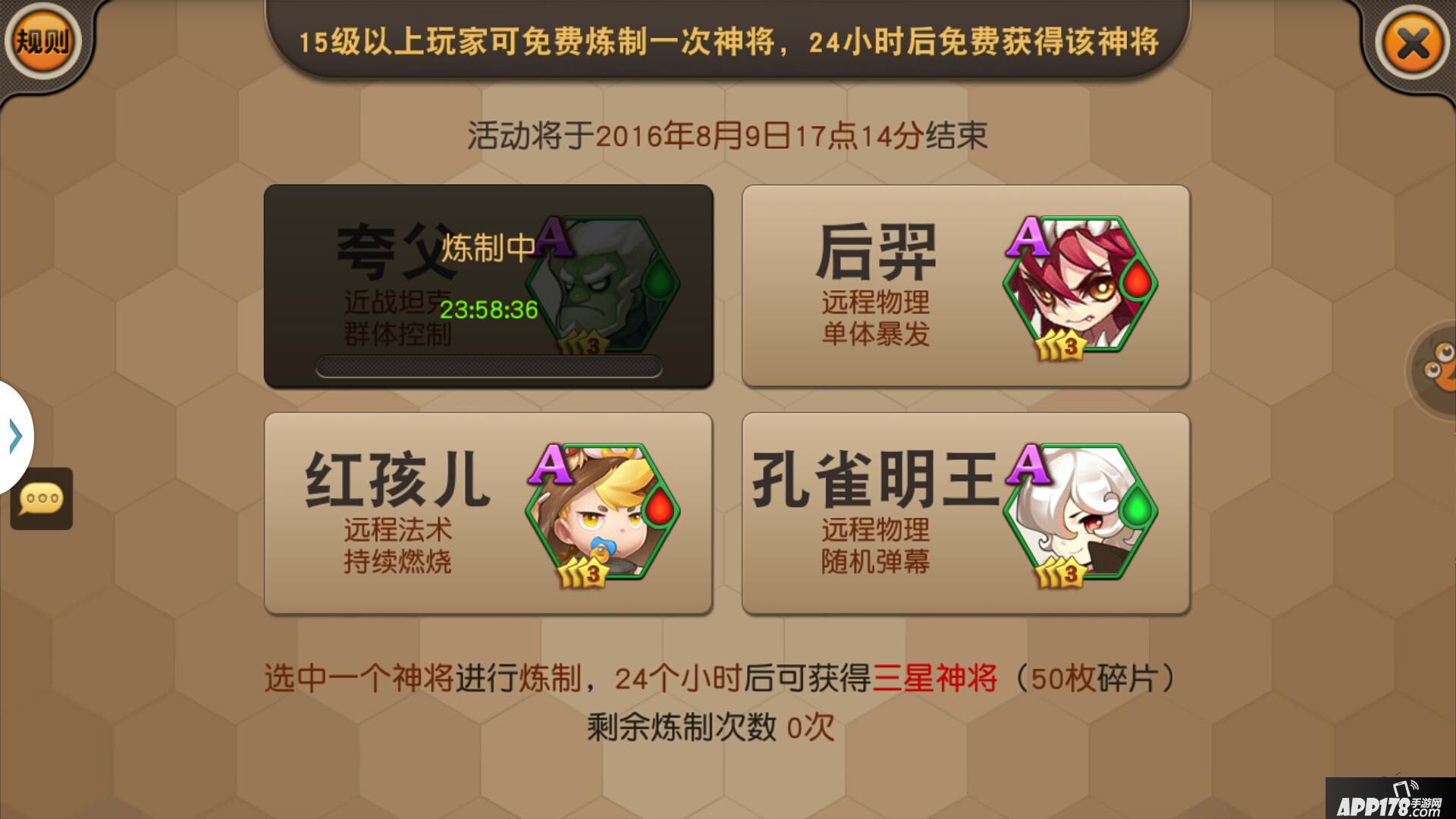 神将炼制是《天域幻想》给新手的一个福利,在开服7日内,玩家可以在夸父、后羿、红孩儿、孔雀明王四个资质为A级的神将中选择一位进行炼制,24小时后可以获得该神将的碎片,从而进行解锁。
