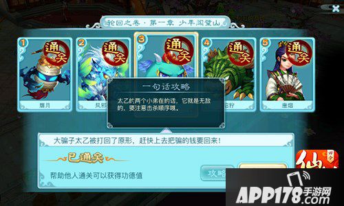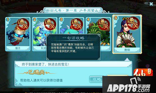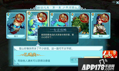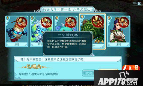 每一关的下面,都会有一个“攻略”的按钮,上面写着一句话攻略,点开看下就能明白本关最重要的难点在哪里,闯关之前一定不要忘了看一下喔。赝月关卡中,酒坛妖的个数要多于小赝月,否则大赝月会发怒的,所以要优先击杀左右两个小赝月然后集火BOSS。这关比较简单,装备过关很容易就过啦!