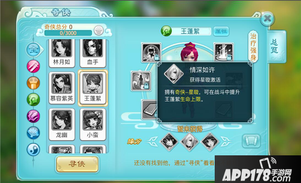 情深如许:拥有奇侠-星璇,可在战斗中提升王蓬絮生命上限。