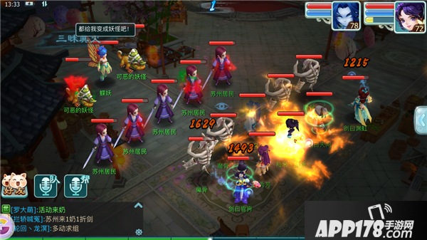 第一回合,boss会给小弟上双攻buff。注意不要打苏州居民,可以封印苏州居民(蝶妖血量较多,建议最后击杀)。