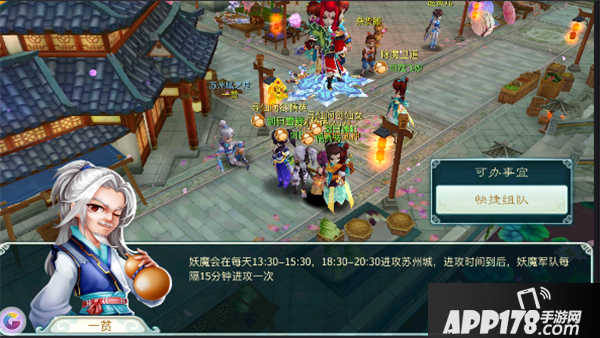 活动开始前我们需要先组一个队伍,毕竟孤掌难鸣,没有队伍的小伙伴们可以来到苏州城,找到一贫进行快捷组队。