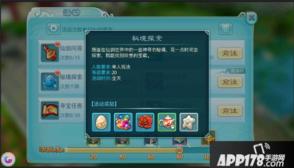 之后按照主线引导,升到20级会开放师门任务及秘境探索,可以在屏幕左上角活动选项中查看,秘境探索可以获得物品道具(建议首先探索小铜钱,15分钟一次可以快速提升秘境等级)。