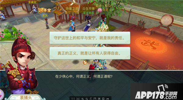 继续我们的主线剧情,达到15级时,会来到一个叫裴捕头那里选择阵营,这个选择一定要慎重,选择“守护这世上的和平与安宁,就是我的责任”会加入仙盟,选择“真正的正义,就是让所有人获得自由”会加入剑盟,两个阵营在PK区域可以进行PK,在PK区域两个阵营不能互相组队。