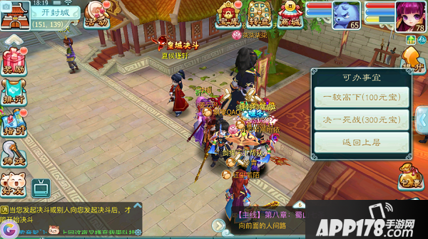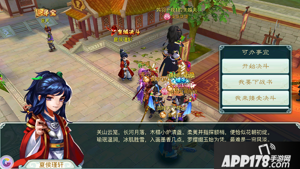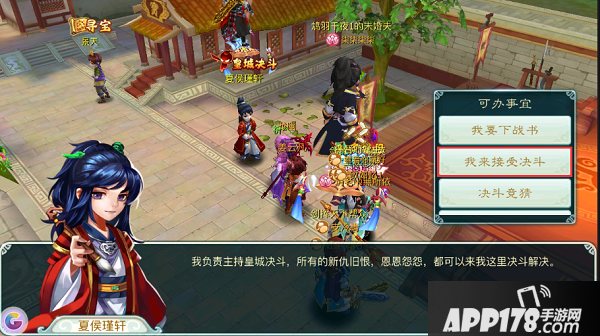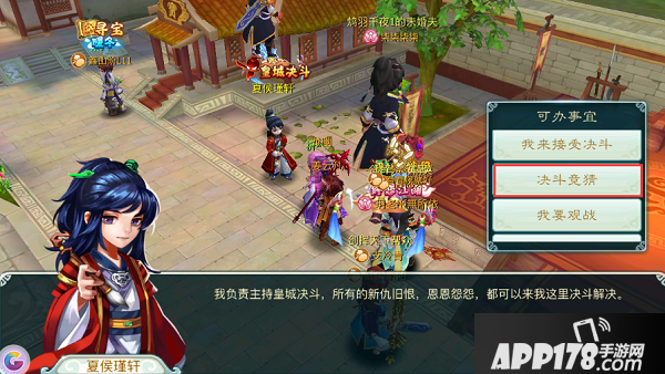 60级以上玩家可以去寻找开封城中的夏侯瑾轩,向自己的宿命对手下战书,并在众人的见证下进行决斗: