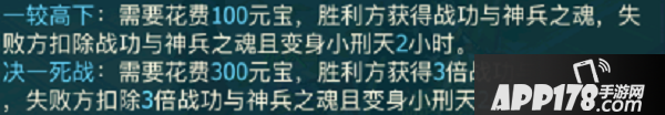 战书分为一较高下(下战书需花费100元宝)和决一死战(下战书需花费300元宝)